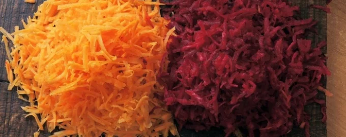 - Radeți sfecla roșie, morcovii pe o răzătoare coreeană de morcovi.