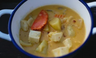Macrou nu poate fi doar copt sau sărat, ci și transformat într-o supă foarte gustoasă și bogată. Acesta este un mod rapid de a pregăti o cină din macrou cu cartofi, orez și legume.